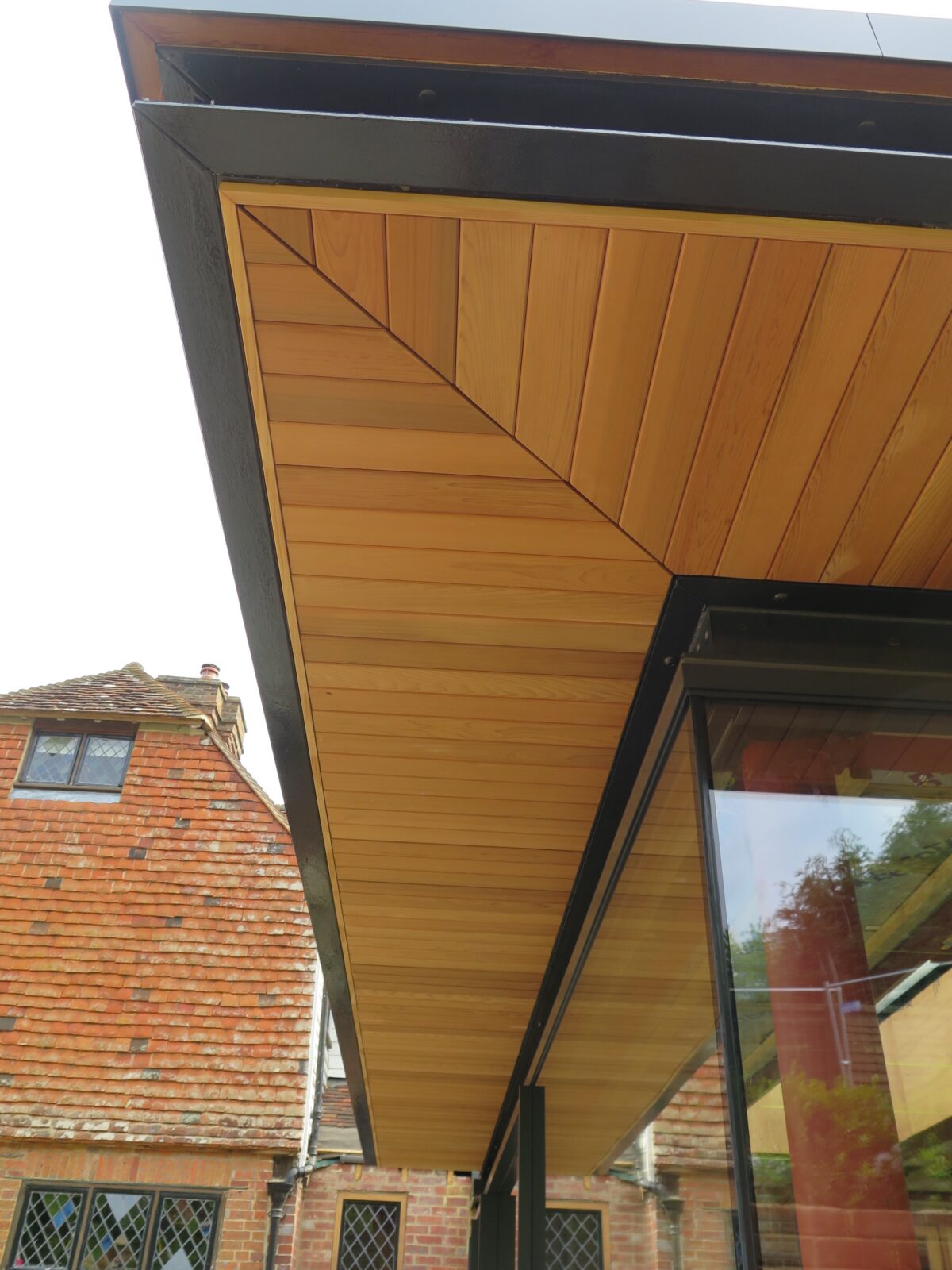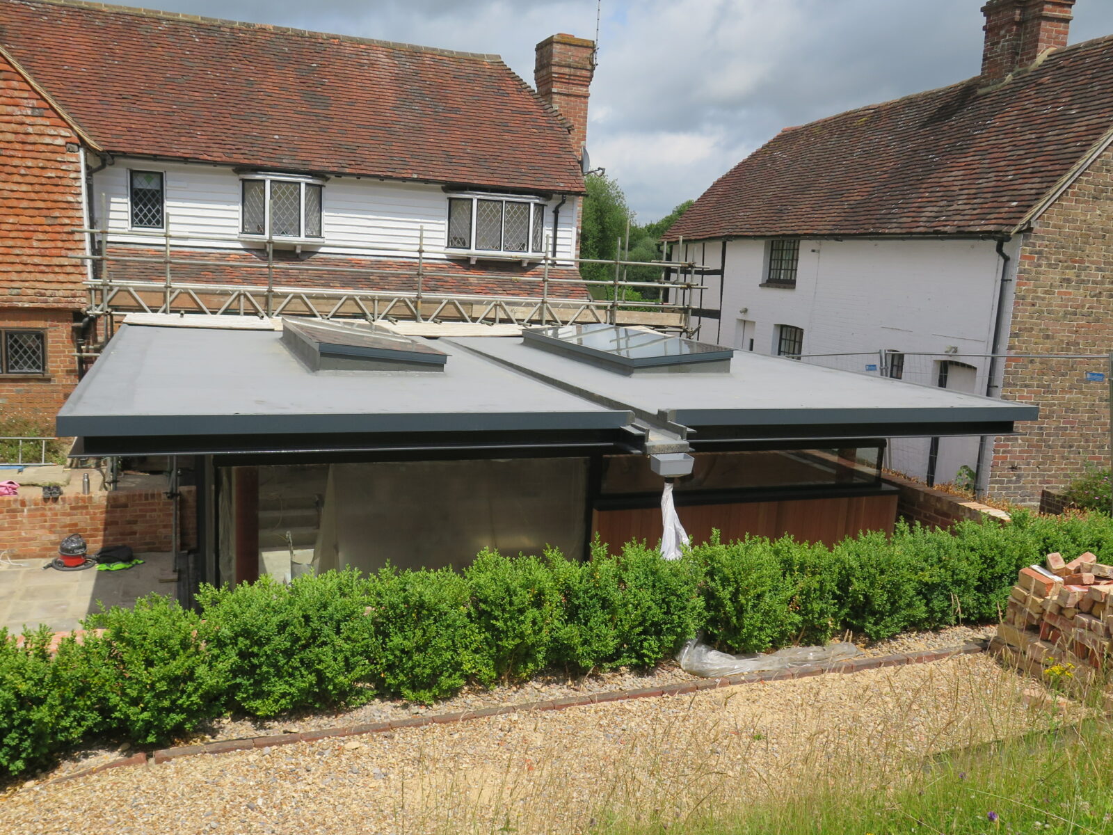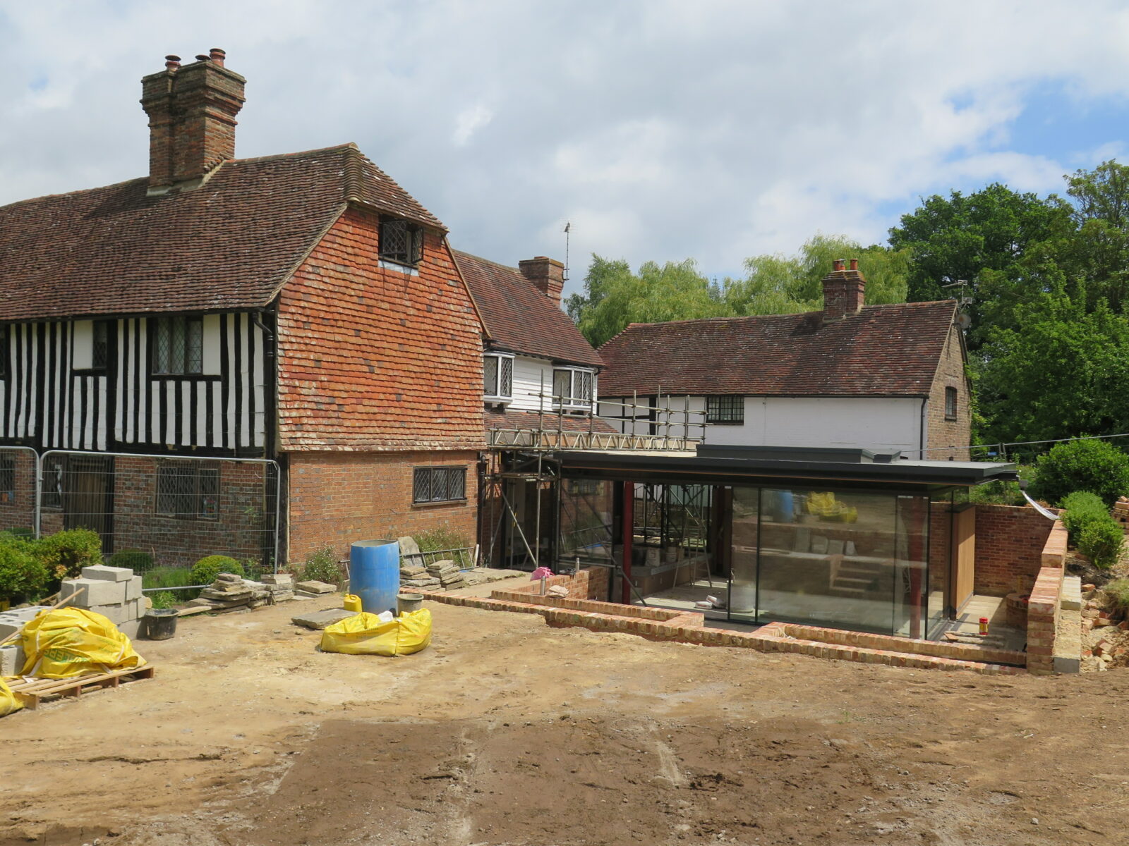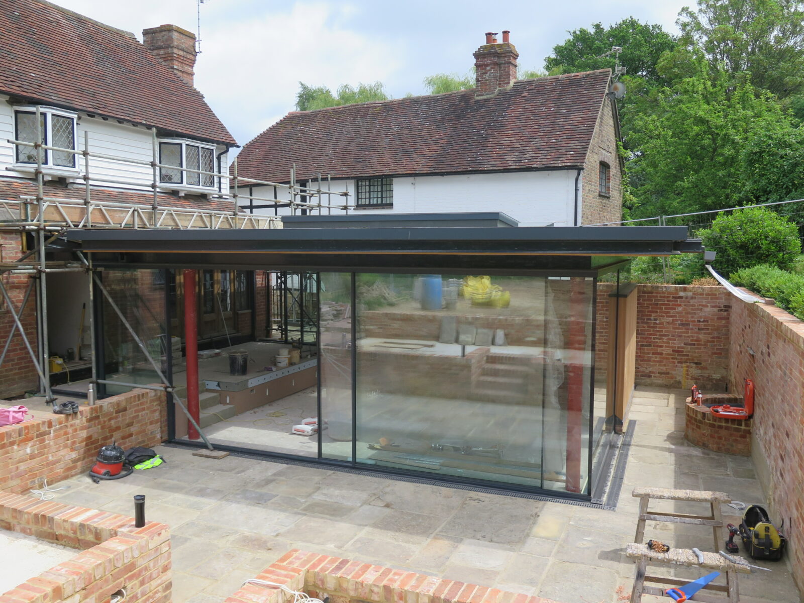 Founthill Farm is an early 16th Century Grade II* timber framed farmhouse part of a small farmstead on the outskirts of Newick. The principal early 16th Century timber framed range has exposed original close studwork with lime plaster infill. The problem was trying to appropriately extend this fine traditional building to provide an exciting and more generous new kitchen and dining wing as the existing plan is compromised by modern spatial standards. The scheme was designed as a freestanding contemporary glass pavilion constructed within a sunken brick courtyard to the south elevation initially with a narrow umbilical fully glazed link to the main house. This was widened at clients request into a fully glazed mezzanine and granted Planning & Listed Building and Building consent.