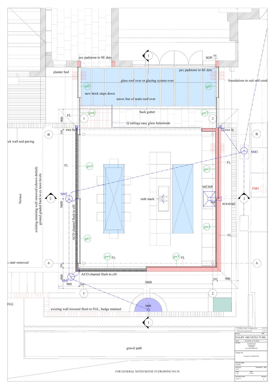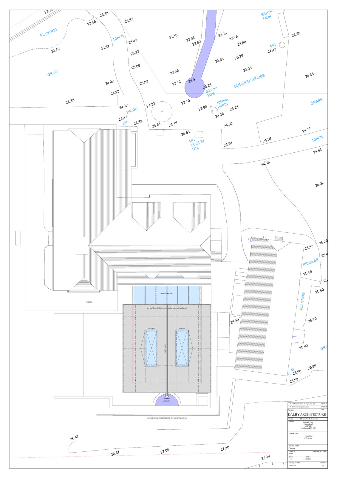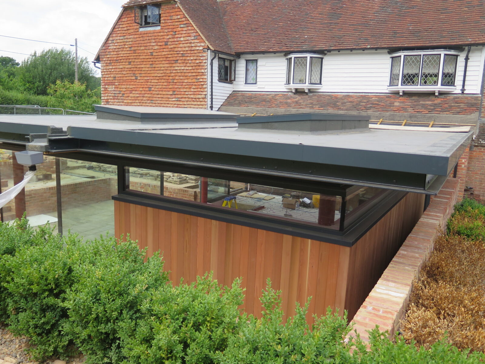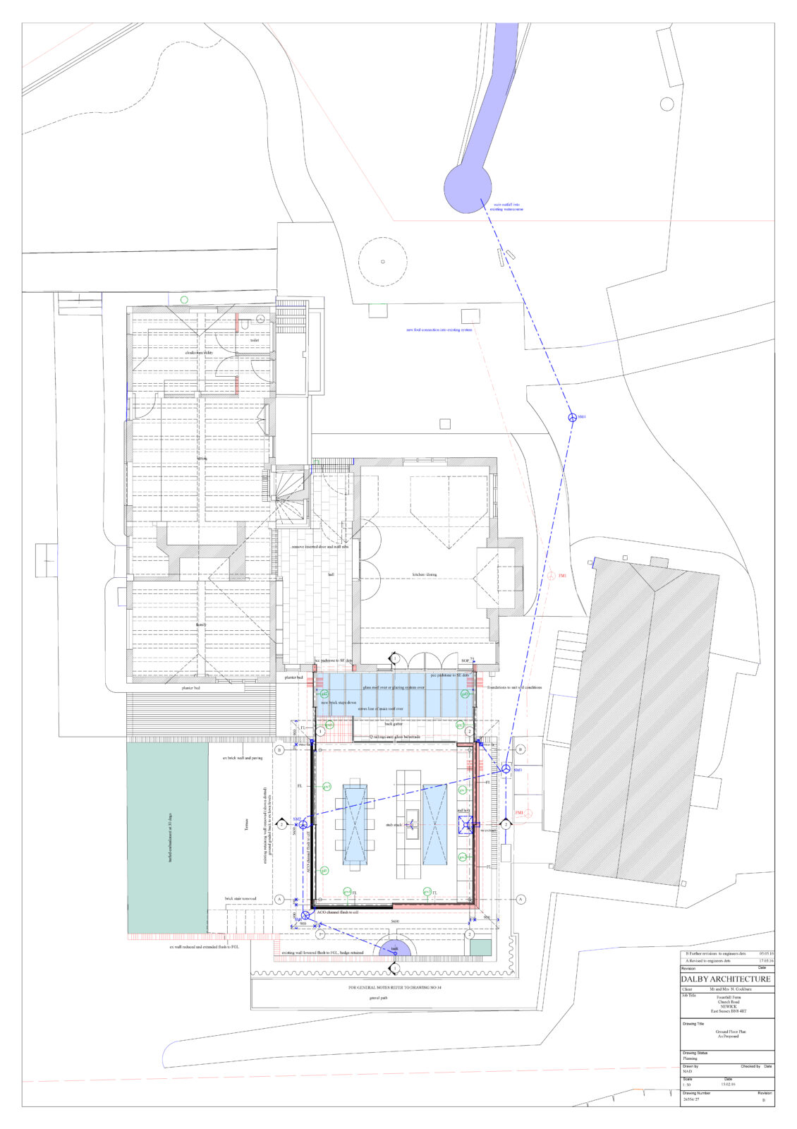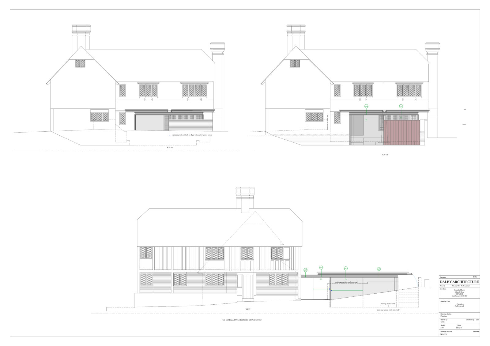 Founthill Farm is an early 16th Century Grade II* timber framed farmhouse part of a small farmstead on the outskirts of Newick. The principal early 16th Century timber framed range has exposed original close studwork with lime plaster infill. The problem was trying to appropriately extend this fine traditional building to provide an exciting and more generous new kitchen and dining wing as the existing plan is compromised by modern spatial standards. The scheme was designed as a freestanding contemporary glass pavilion constructed within a sunken brick courtyard to the south elevation initially with a narrow umbilical fully glazed link to the main house. This was widened at clients request into a fully glazed mezzanine and granted Planning & Listed Building and Building consent.