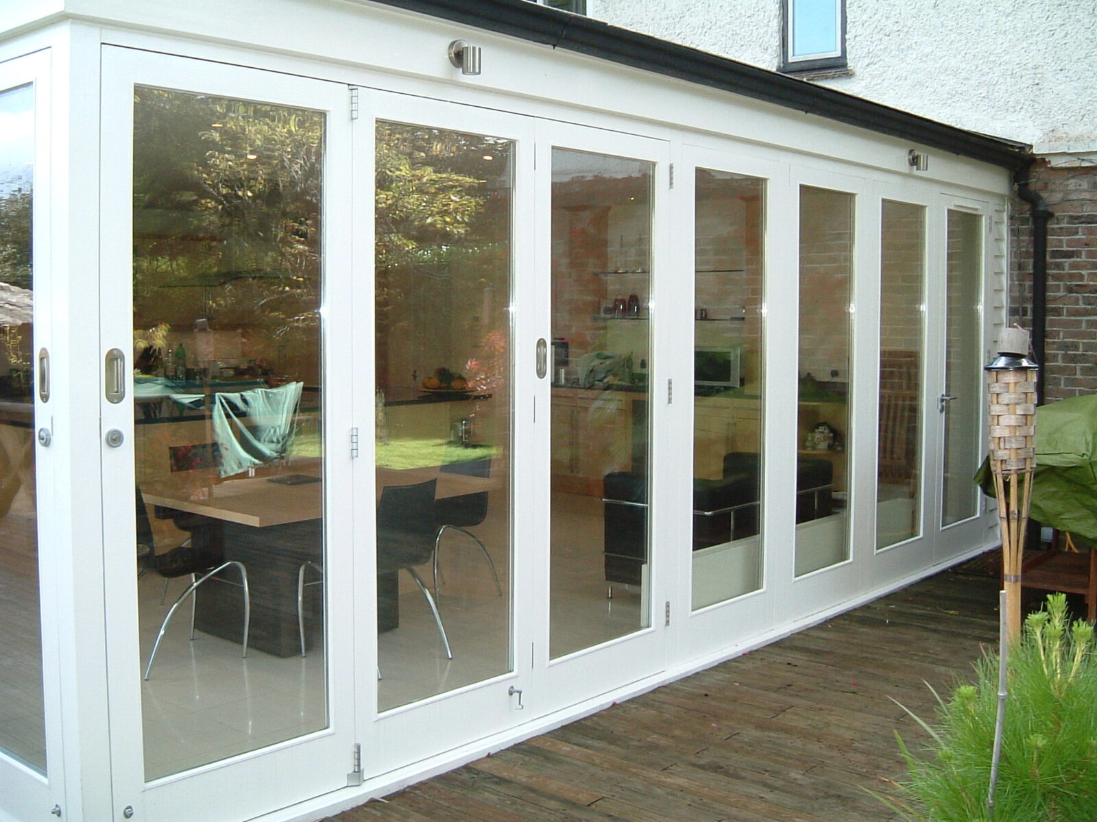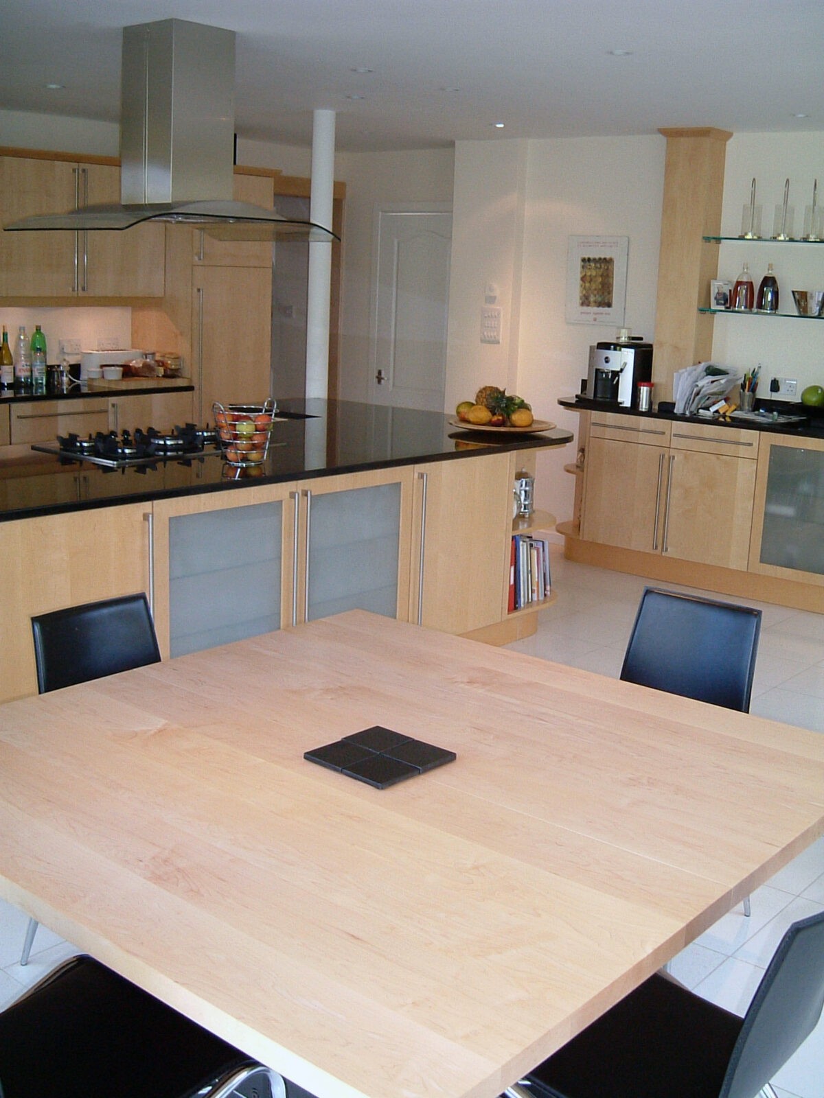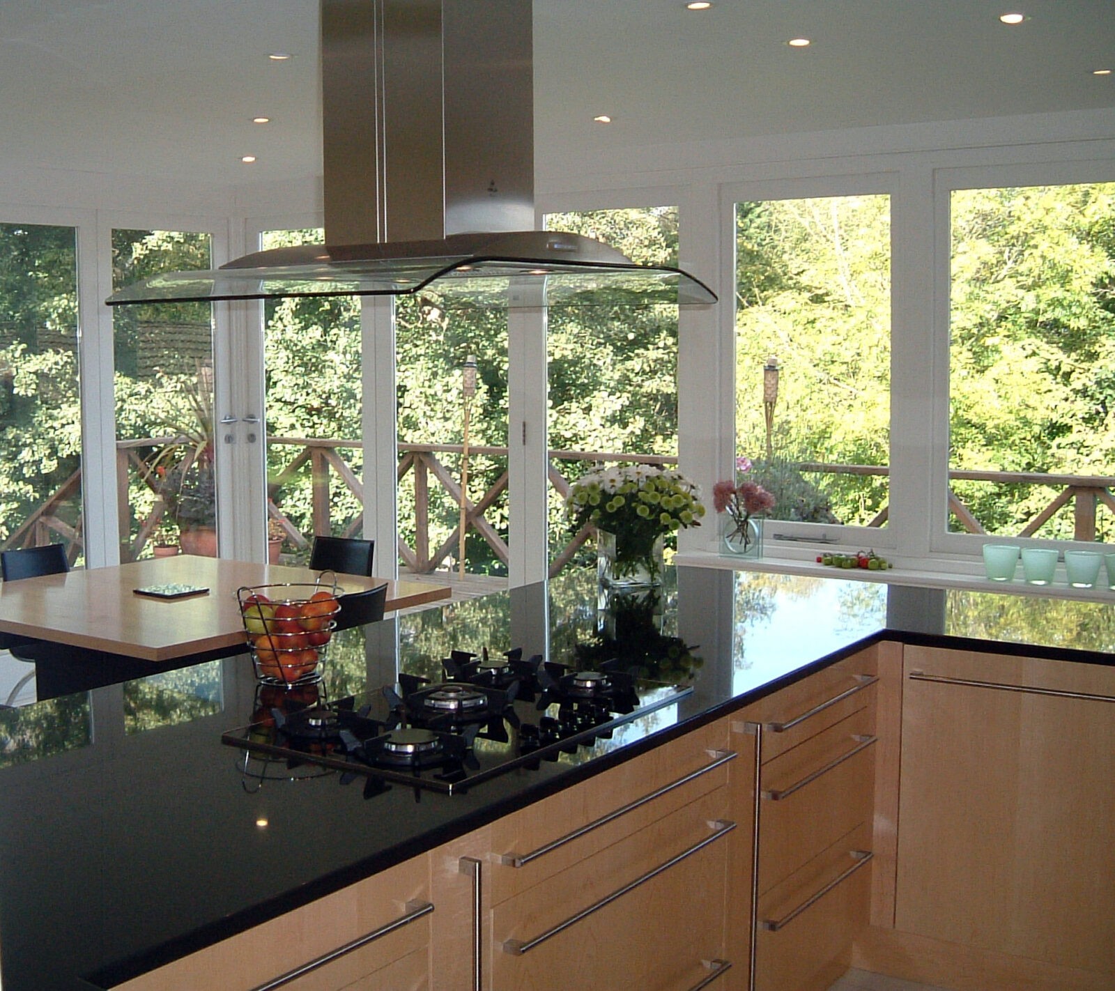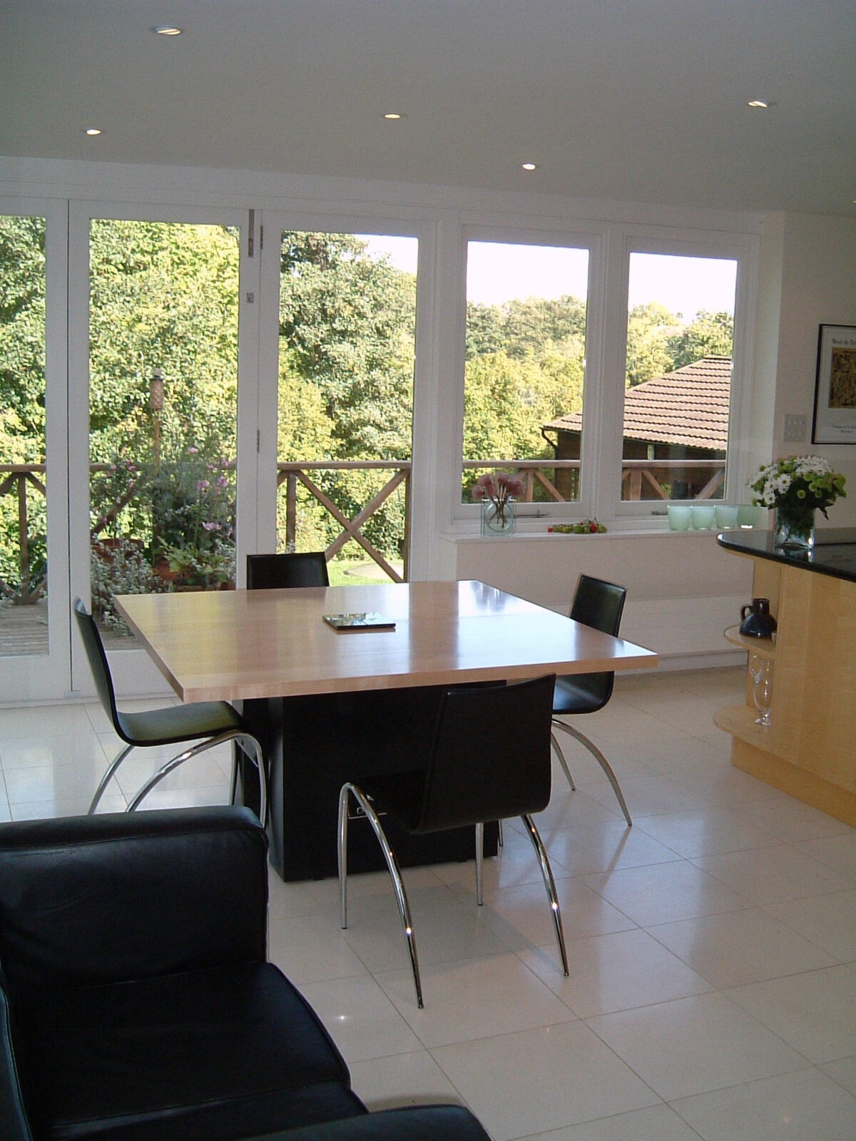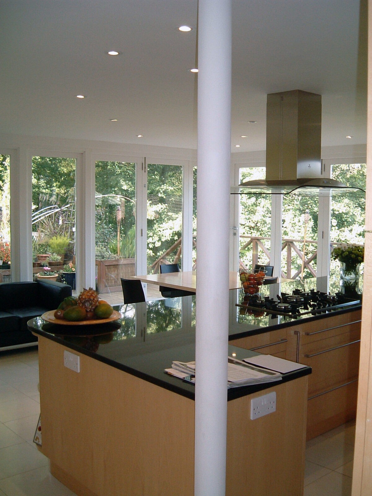 This house sits high looking over a brook and into an extensive tree canopy. NDA was asked to prepare designs for a new kitchen/dining/utility range and the problem was how to avoid supporting the second storey which returned across the middle of the plan. We proposed a new steel frame with slender round columns placed to suit the kitchen layout so that the interior was unaffected by constructional compromise. The utility area was concealed behind sliding shot-blasted glass doors which slide into the dividing wall thickness. The dining area has top mounted sliding folding doors on two sides of the corner column allowing unrestricted views across the tree canopy and garden.
