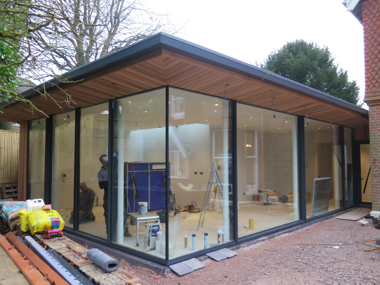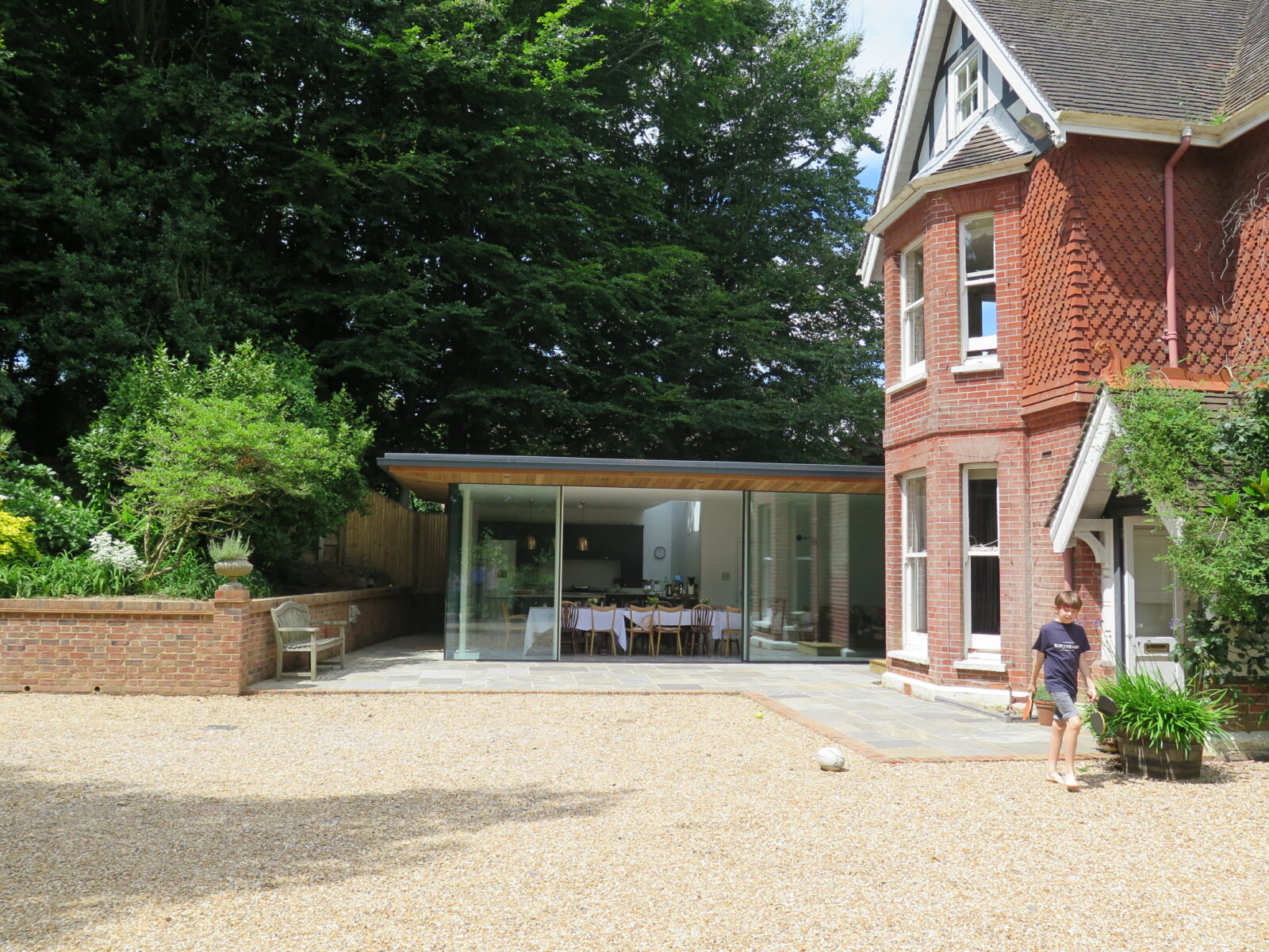 A contemporary glass single storey wing attached to a substantial Grade II Listed Victorian house. The existing house was originally a bold red brick and tile hung extension attached to a stucco Georgian two window house and the  house was  split into two dwellings in the 1960s.  To achieve the split a small flat roofed extension was added to provide a kitchen which meant the subject house has inadequate service accommodation for a house of this scale and furthermore it is tucked away in the north corner of the site with no outlook. The proposed new wing provides  a strong contrast to the existing building and will enable commensurate quality accommodation including a new kitchen & dining room looking south across the fine gardens with new utility, storage and service accommodation.
