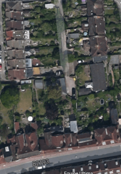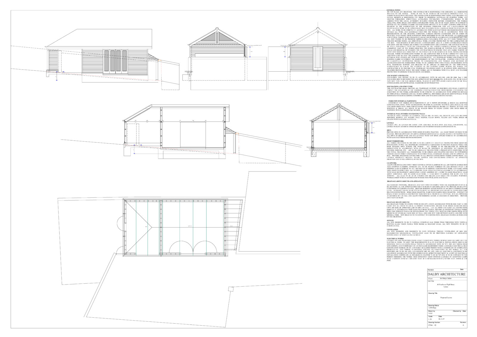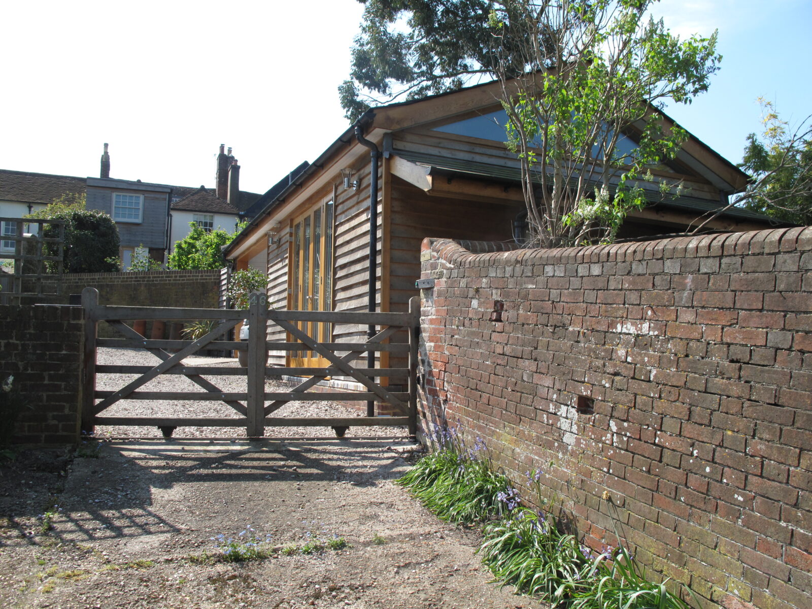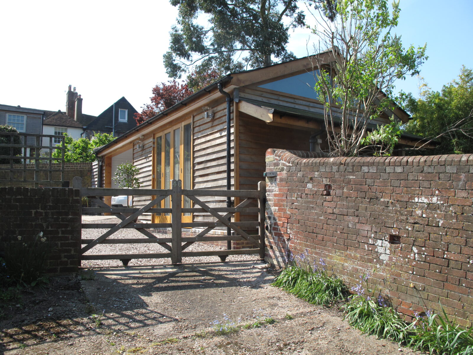 New timber framed garage/office/garden building in tight urban site at rear of Listed Building in Southover Street Lewes. The new building allows for the sloping site and sits alongside two 18th Century flint boundary walls heading up a narrow drive running up to the rear of the property from the road running below.