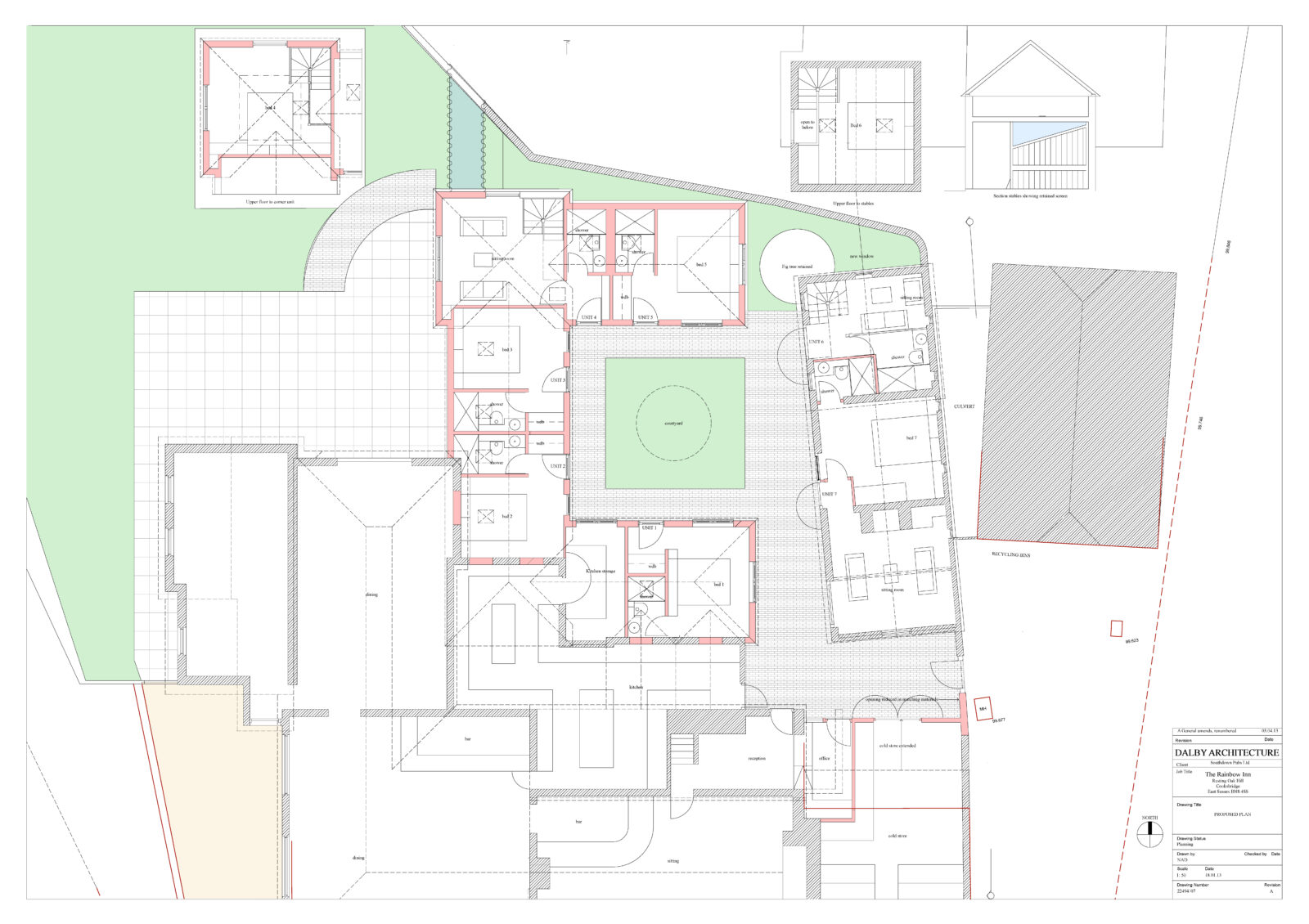The scheme NDA designed was granted Full Listed Building & Planning Approval by Lewes DC providing 7 double bedroom units of Hotel Accommodation in the form of a new courtyard range plus the conversion of an old Stable, Forge & Cart Shed (which are curtilage listed) to 3 further units with associated car parking.